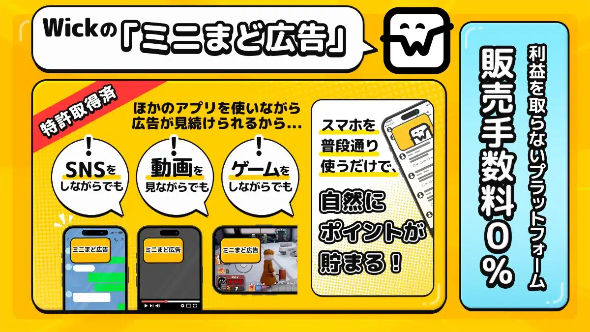 革新的な仕組みの1つに、特許取得済みの「ミニまど広告」という機能があります。これは、YouTubeや他のアプリを見ながらWickポイントを貯めることができ、そのWickポイントでWickのマンガを読んだり、推しの投稿に特別ないいねを送ることができます。