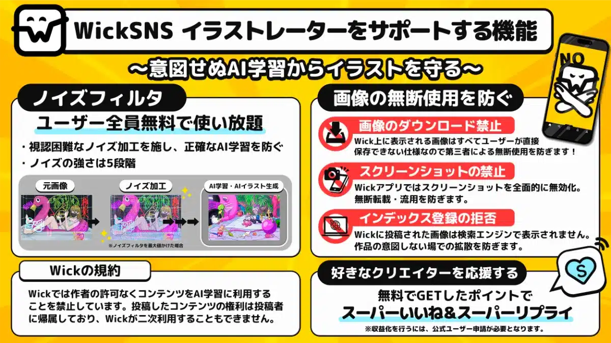 Wickはこれを危惧し、AI学習や画像保存を防止させるノイズフィルタ」、「ダウンロード禁止」、「スクリーンショット制限などの仕組みを備えています。