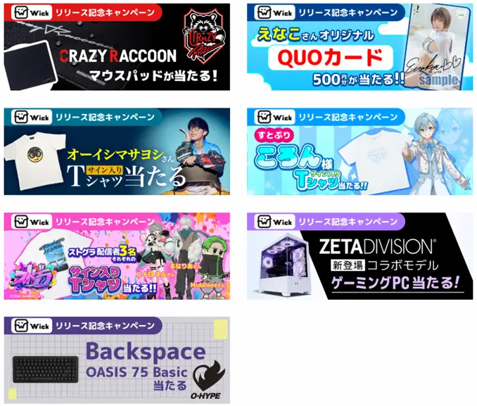 AmazonギフトやWickポイントがもらえるログインボーナスルーレットのキャンペーンや有名クリエイターの賞品が当たるコラボキャンペーンなどが開催されています。